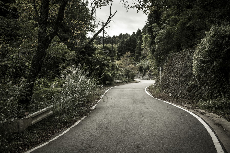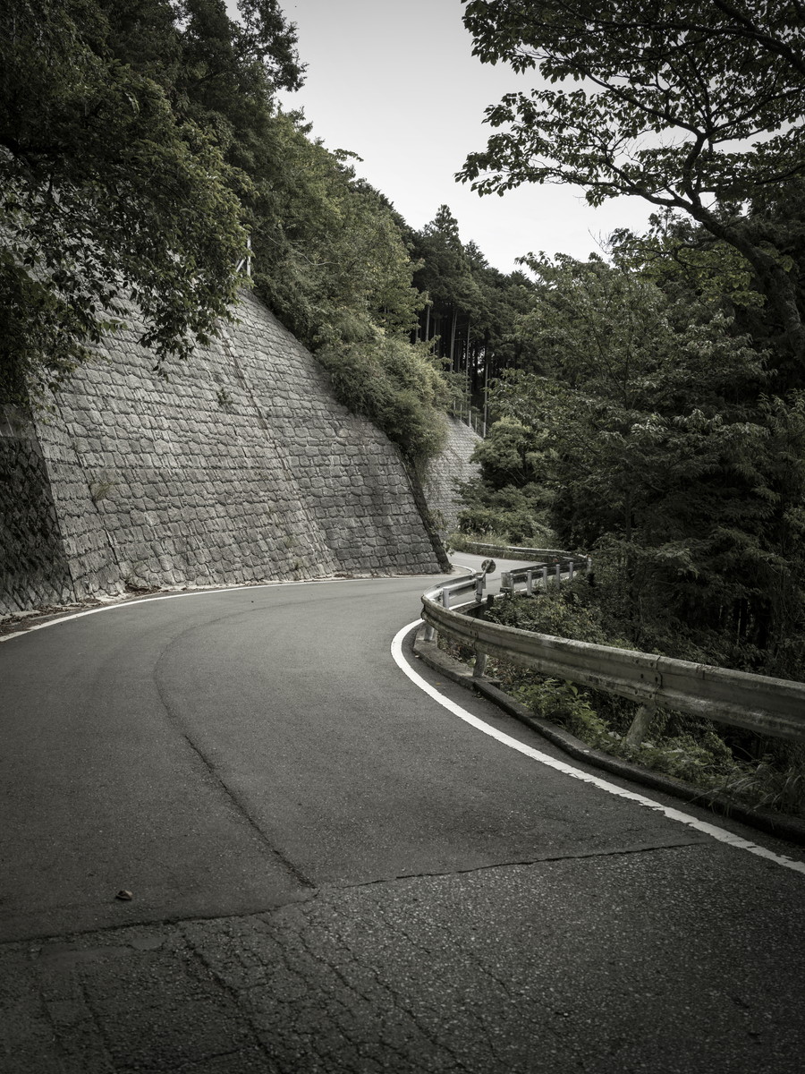 蓑毛はかつて東に位置する大山への参拝路として栄えた過去を持ち、この鳥居はその大山信仰の名残でもある。程なくして、人家はなくなり林道を通る。ここに至ると、歩道には雑草が生い茂り、土砂崩れにひん曲げられたガードレール、土砂の染み込んだ赤茶けた路面と、人里を離れて異界に来てしまったと錯覚するほど。休日ならば息を切らしペダルを踏む数奇者(私であり、あなただ)が前後にいるかもしれないが、平日の朝などは先ほどまでいた秦野市街の喧騒がまるでうそのように静まり返っている。
