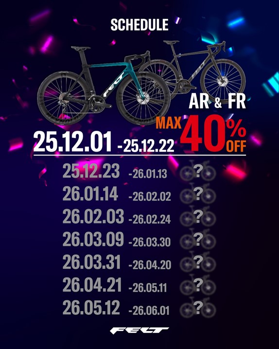 研究と実績によって裏打ちされた確かな技術力を強みとするロードバイクブランドFELT Bicycles(フェルトバイシクルズ)が、2025年12月1日よりスマート購入サービス「FELTクリック&コレクト WEBオーダーサービス」にて期間限定のセール販売を開始する。第一弾はARとFRが対象となり、来年1月13日までの期間となる。