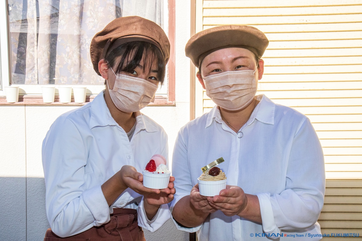 カフェスイーツからガッツリ系の食事までバリエーションは豊かで、参加者たちは「kokoro食堂」の岩清水豚を使ったトロトロなんこつうどんや、「道の駅 熊野・花の窟」のめはり寿司といった郷土の味に舌鼓を打った。また、スイーツ好きにはたまらないマカロンショートケーキ(パティスリーアフレイル)や、みかんジュース(さぎりの里)なども振る舞われ、カロリー消費が追いつかないほどの「グルメライド」となった。