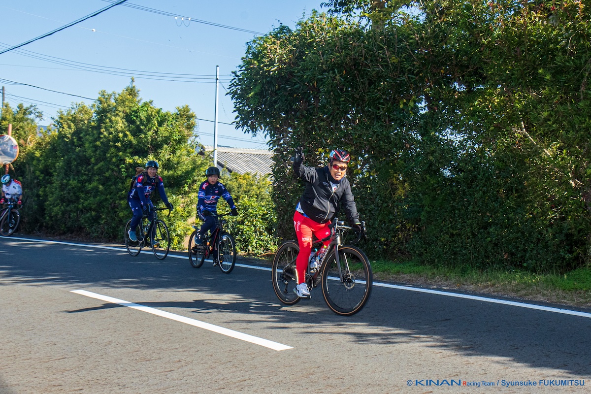 キナンレーシングチームの選手たちも数グループに分かれてコースへ繰り出し、参加者たちとテーブルを囲んで談笑したり、道中でトレインを組んだりと、レース会場では味わえない密な交流を楽しんだ。短いオフシーズンを終え、翌シーズンへのトレーニングを開始する時期でもある選手たちにとって、ファンからの温かい声援はこれ以上ないエネルギーチャージとなったようだ。