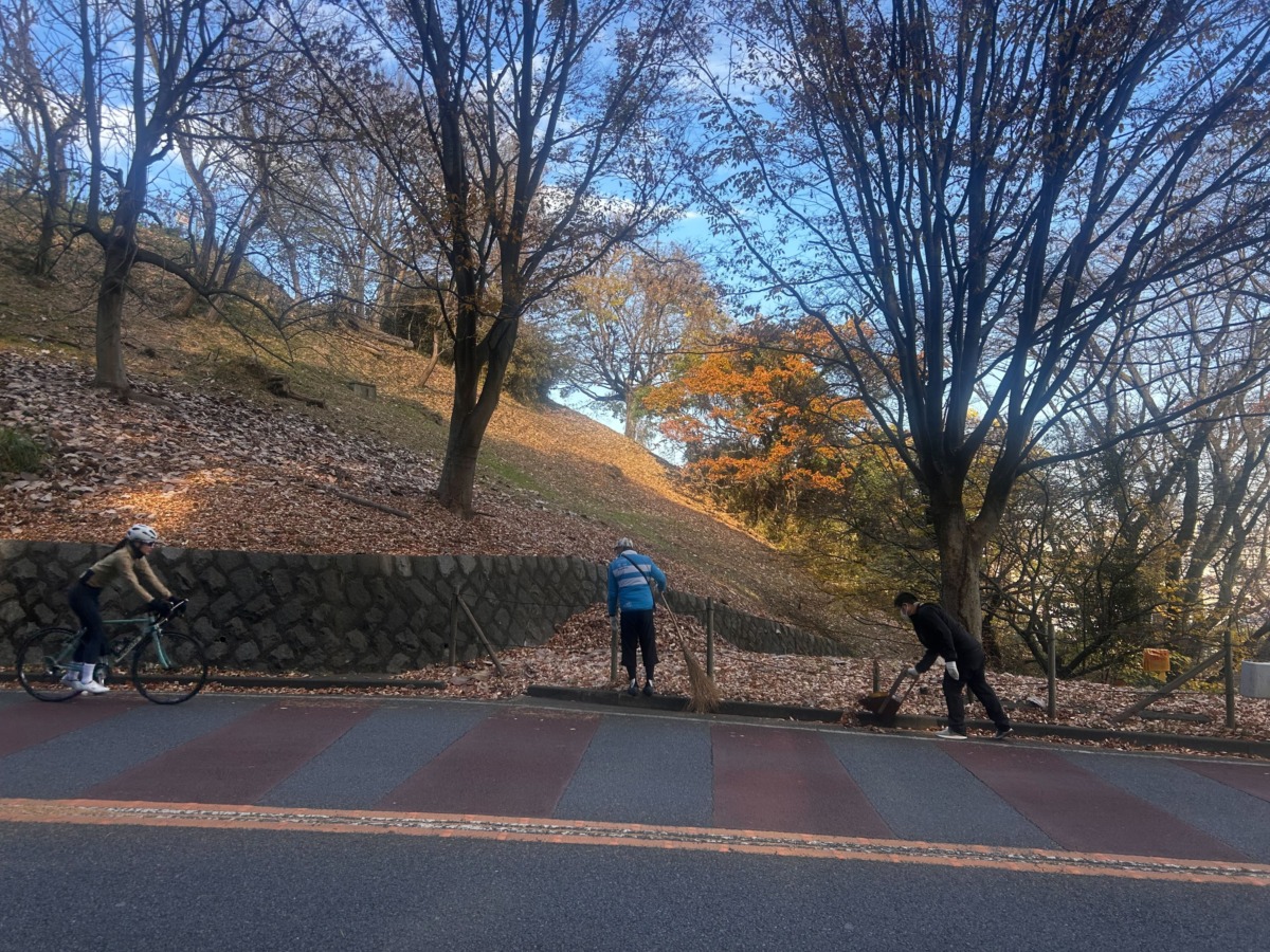 交通量のある坂道での作業ということもあり、参加者は声を掛け合いながら慎重に進行した。掃き掃除、落ち葉の収集、運搬などを分担し、作業は手際よく進んだ。