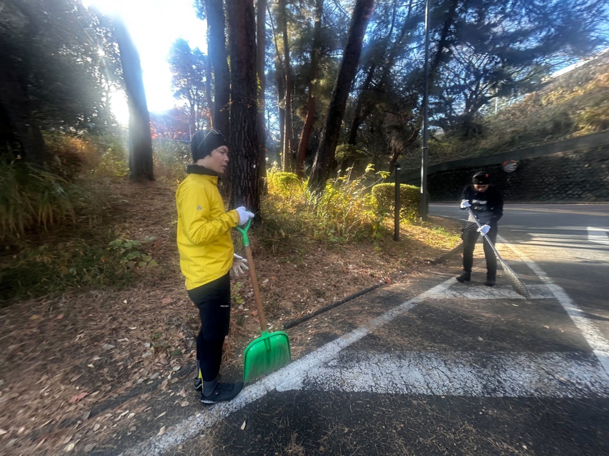 いろは坂清掃は、落ち葉によるスリップの危険を減らすこと、そして日頃走らせてもらっている坂や地域に感謝を伝えることを目的に、長年継続されてきた活動だ。
