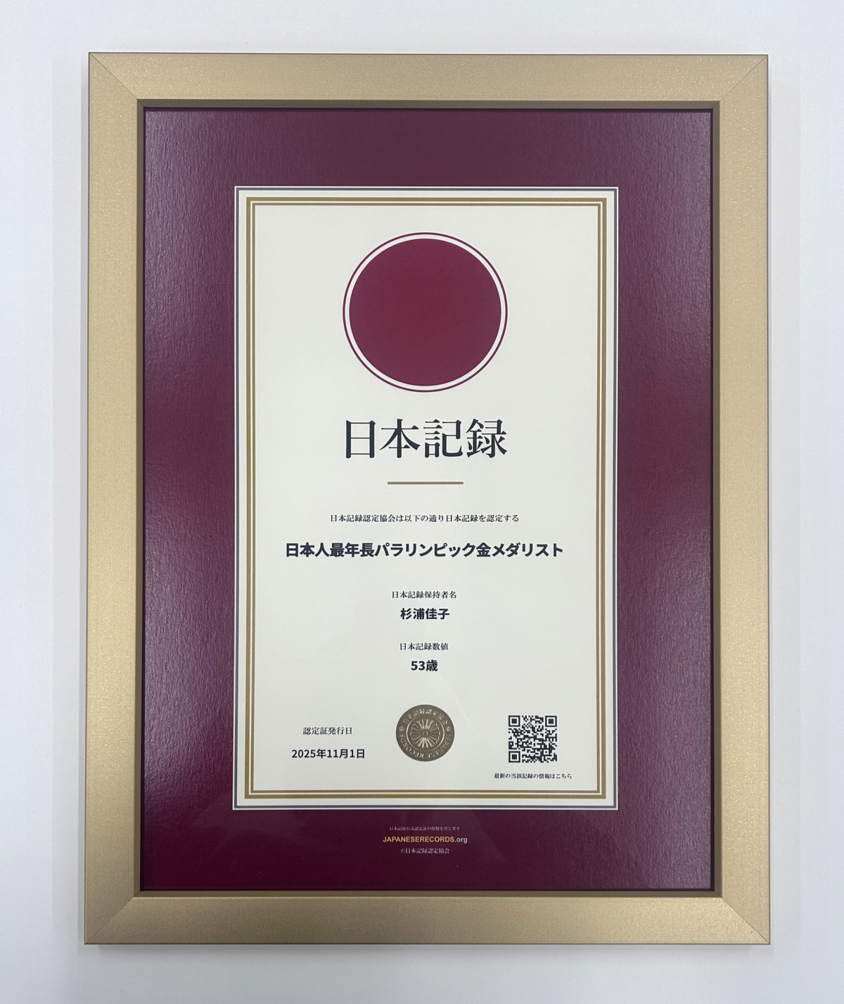 「この度は、日本記録認定協会様より「日本人パラリンピック最年長金メダリスト」として公式認定していただけましたこと、誠に光栄に存じます。スポーツの世界では、高い筋力や迅速な疲労回復力が必要とされ、常識的に考えれば高齢である自分は競技のスタート地点にも立つことさえ困難だったと思います。そんな私を、「あなたならできる」と信じ、熱心にご支援ご指導してくださった皆さまのお陰で、若手選手たちに勝利し、金メダルを獲得することができました。この栄誉は支えてくださった皆さまなしには成し得ませんでした。心より感謝いたします。