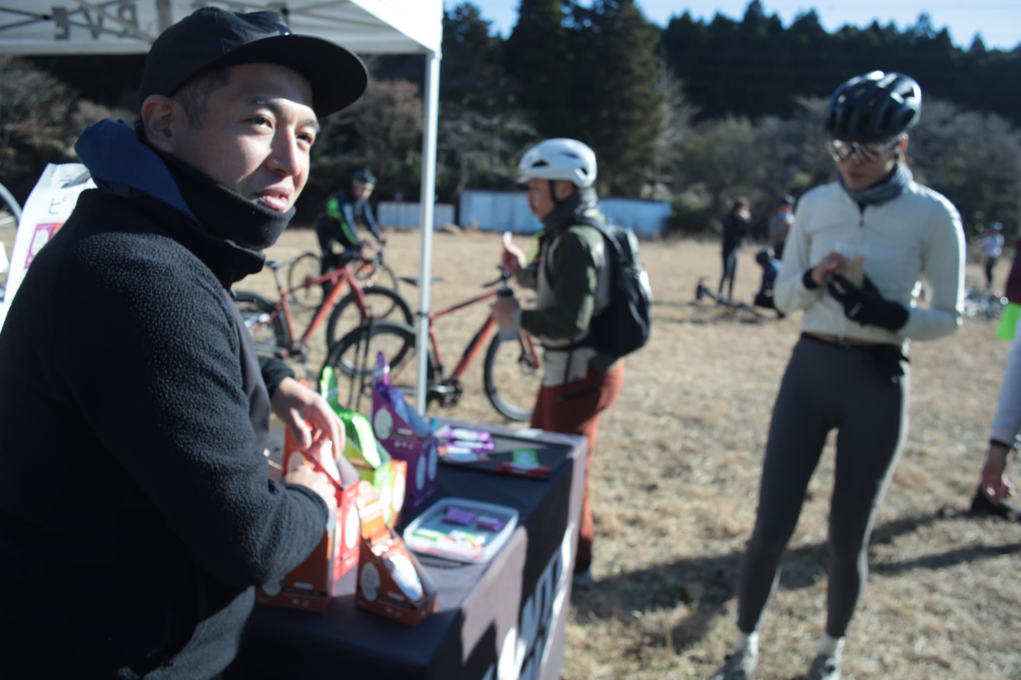 序盤の20km地点にある第一エイドでは、Santa Cruz、Reserveなどを展開するウィンクレル株式会社が参加者を迎えた。グラベルバイクの展示のほか、パラチノースを配合したライスピュレの配布もあり、参加者は補給を片手にスタッフへ質問を投げかけ、製品の話で盛り上がる場面も多かった。走るだけでは終わらない“イベントの厚み”が、ここで一段増した。