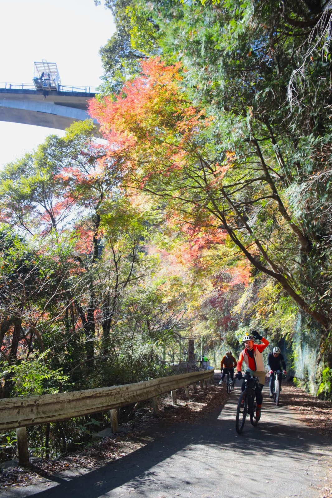 コースはさらに下り、標高の低下、そして時間の経過とともに暖かくなっていく。グラベルと気持ちのいい林道を進むと須津渓谷へ到着した。