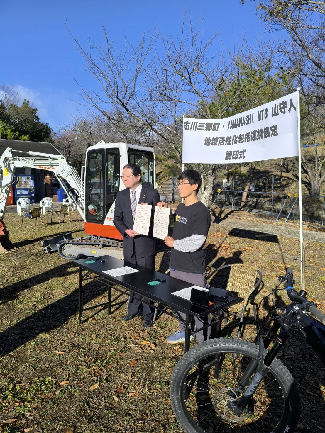 市川三郷町「市川公園MTBフィールド」にて行われた調印式の様子