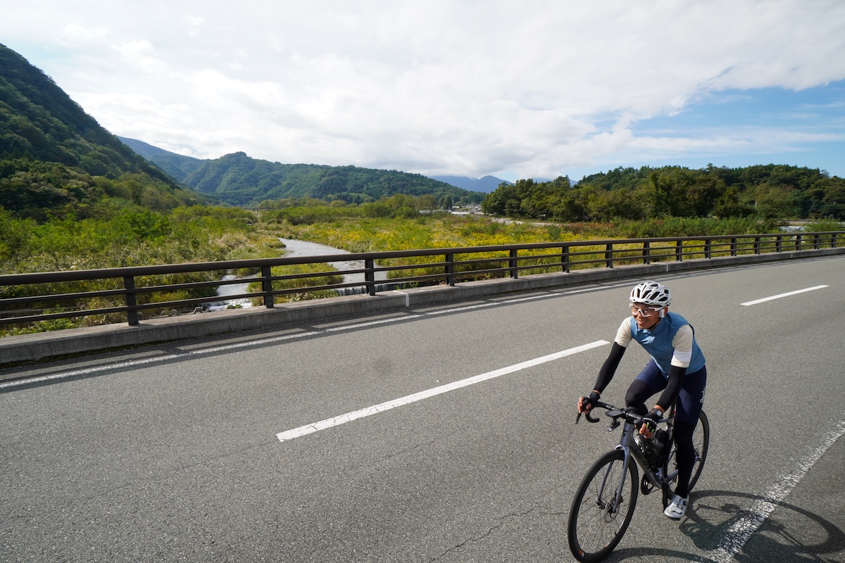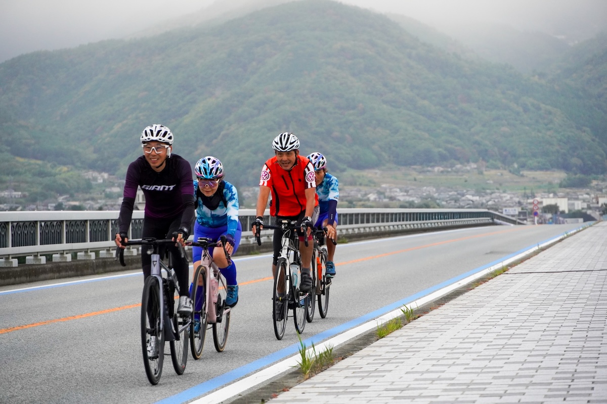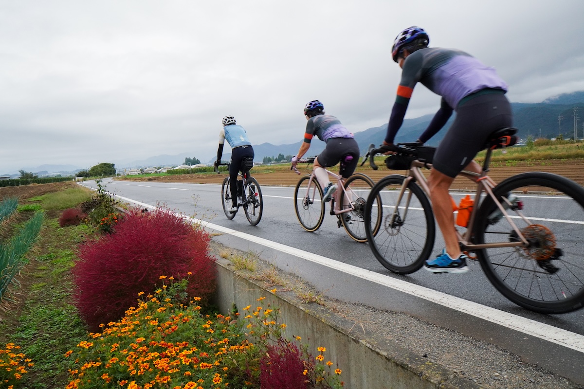 3日目、みなさんに昨日の疲れが残っていないかを確かめるように田代さんが集団の先頭に立って走りだす。この日の最初の目的地は50km先にある道の駅、今井恵みの里。ルートは、国道147号線の西側を通る、日本アルプスサラダ街道。クルマの通りが少なく、サイクリストが安心して走れる道だ。黄金KAIDOは、そんな走りやすいルートを選んで設定されている。