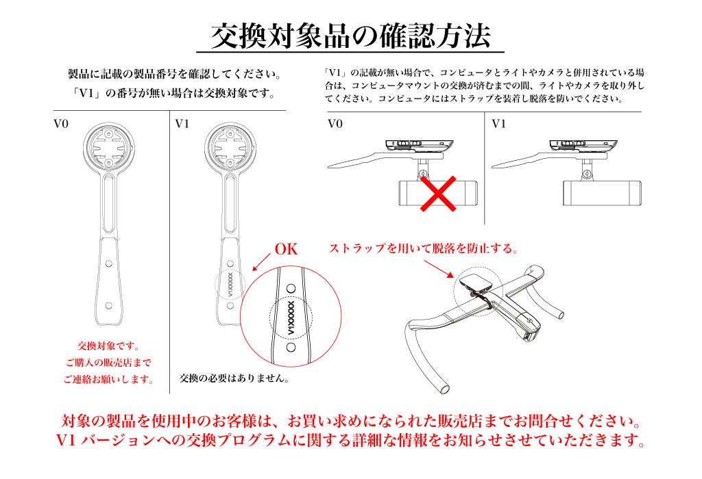 「V1」マークが表示されていない当該製品を使用中のユーザーは、直ちにサイクルコンピューターとライトやカメラなどを下部に同時装着する(併用する)使用を中止する必要がある。重量のある機器を併用することでマウントが破損し、取り付けられた機器の脱落や損傷を招く可能性があるためだ。