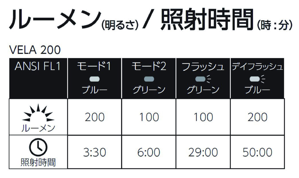 使用時間:3.5時間(ハイモード/点灯200ルーメン)、6時間(ローモード/点灯150ルーメン)、29時間(フラッシュ/点滅100ルーメン)、50時間(デイフラッシュ/点滅200ルーメン)
