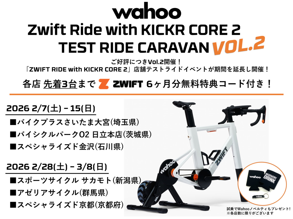 ワフーフィットネスの国内代理店を務めるインターテックが、スマートバイクシステム「ZWIFT RIDE with KICKR CORE 2」の体験イベント「TEST RIDE CARAVAN Vol.2」を開催する。昨年末に好評を博した試乗ツアーの第2弾となり、対象店舗での購入者(各店先着3名)にはZwiftの6ヶ月無料コードがプレゼントされるキャンペーンも実施される。