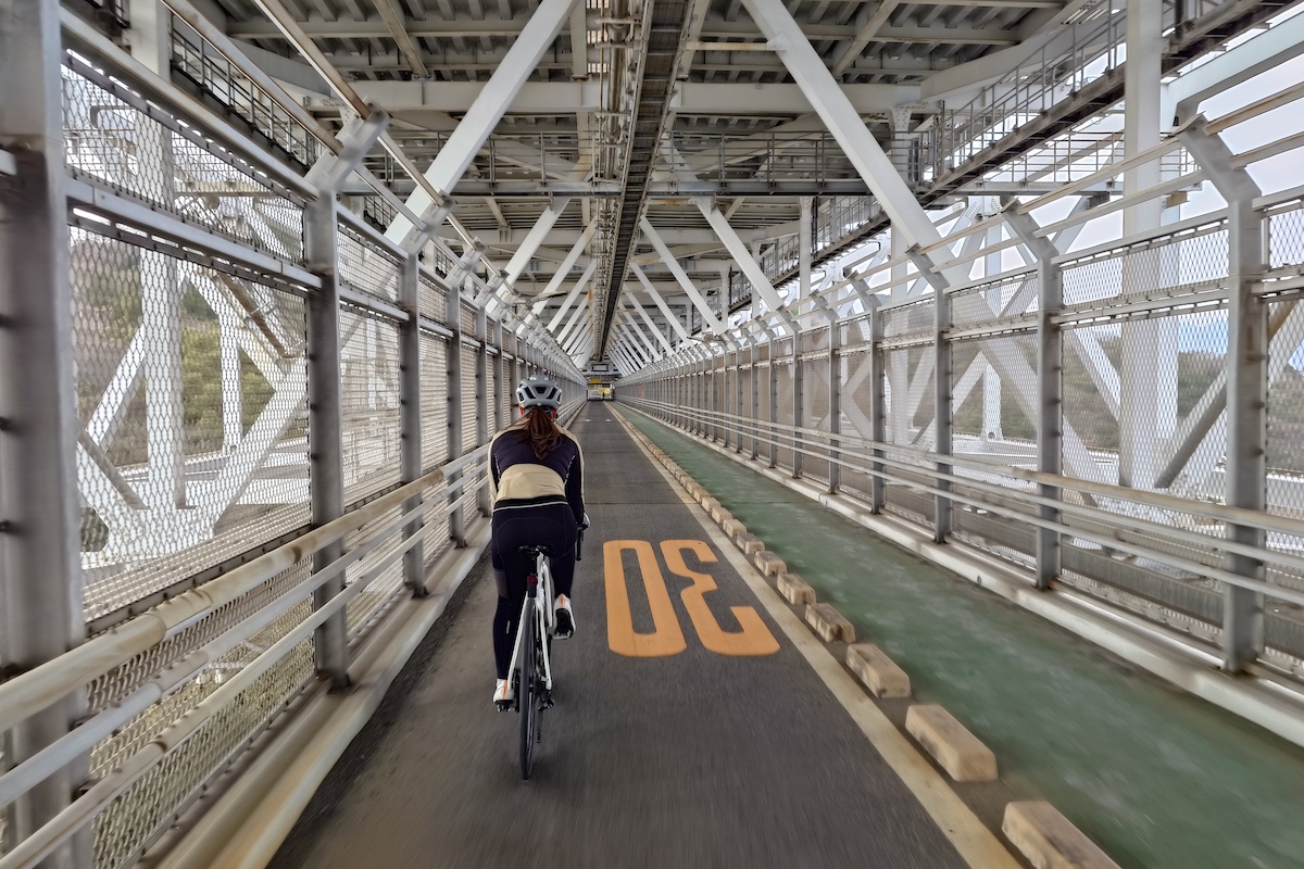 因島大橋は、しまなみ海道で唯一、自動車道の下に自転車歩行者道が設けられている二層構造の吊り橋だ。頭上を走る車の音を聞きながら、鉄骨のトラスに囲まれた独特の空間を進む。まるで巨大な鳥かごの中を飛んでいるような浮遊感は、この橋ならではの体験である。