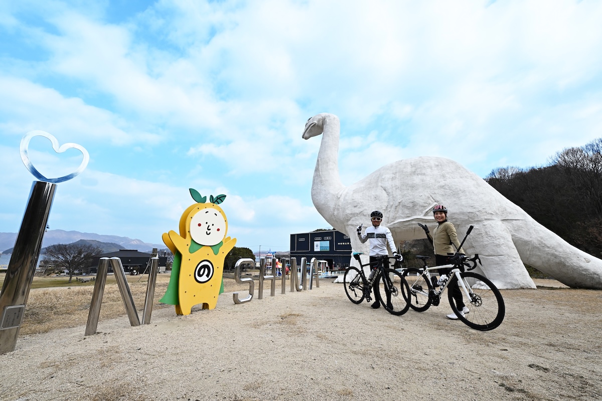 一見シュールなこの恐竜、実は1989年に開催された「海と島の博覧会」の際、PRのために作られた「島ごと博覧会」のシンボルキャラクターなのだという。博覧会終了後もこの地に残り、現在はサイクリストを見守るマスコットとして愛されている。我々も、旅の安全を祈って記念撮影を行った。