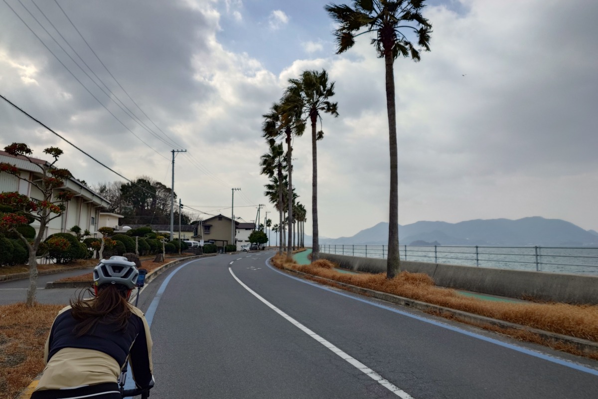 県道81号に入ると、風景は一変した。沿道にはヤシの木が立ち並び、瀬戸田サンセットビーチ周辺はまるで南国リゾートのような開放感だ。前を走るあむちゃんも、海沿いの爽快な道を気持ちよさそうに流している。青い海と空、そして山の斜面に広がるレモン畑の緑。このコントラストこそ、生口島のハイライトだ。