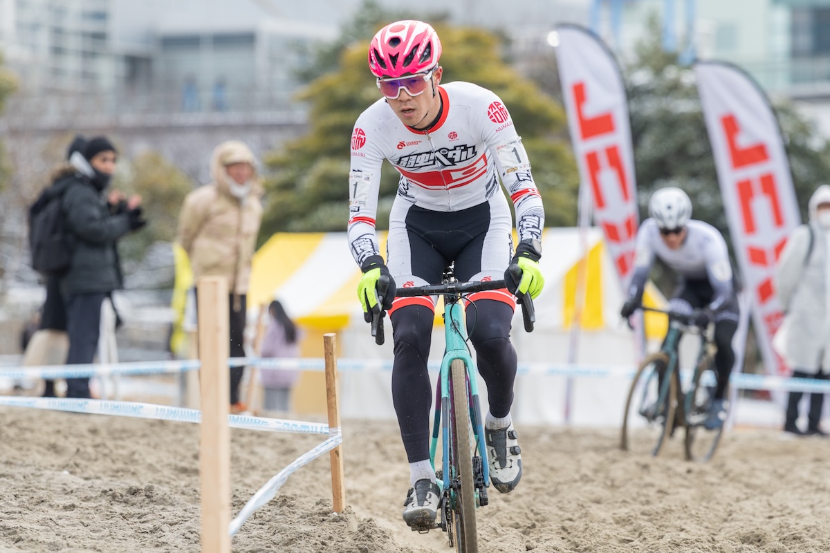 2周目に入るとこのパックが崩壊。抜け出したのは、シーズン序盤をジュニアカテゴリーで走り、終盤にエリートへ挑戦してきた日吉だった。軽やかな走りで砂浜区間をスムーズにこなし単独2番手に浮上する。それに山下が続き、後方では竹村、安藤、小林が粘る展開に。