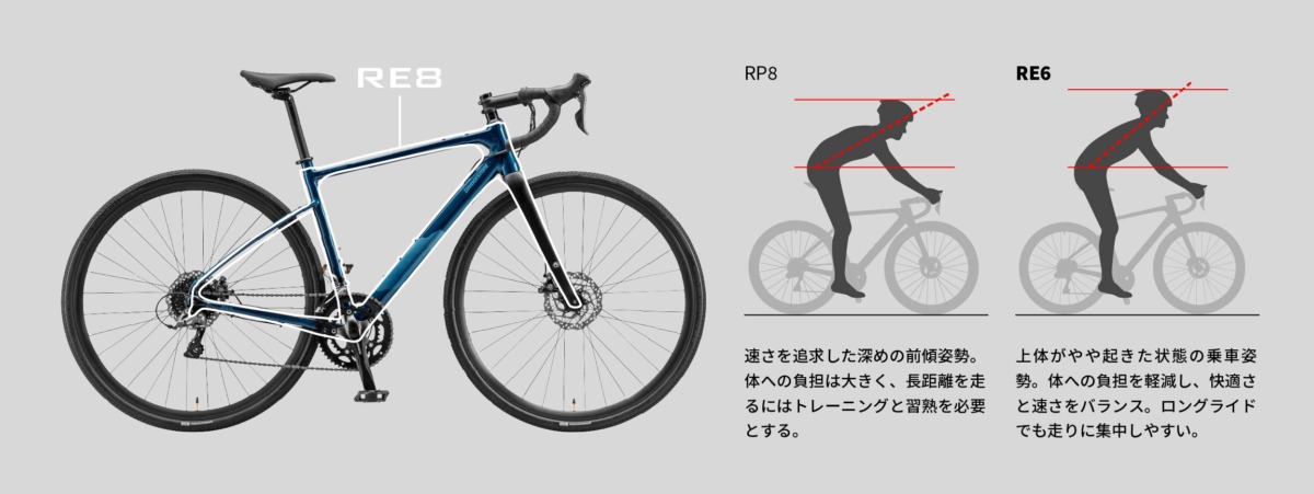 ジオメトリは、身体への負担が少なく直進安定性の高いRE8と同じ設定を採用。楽な姿勢で乗ることができ、安定した走行が可能だ。これにより、前傾姿勢や操作に不安のある初心者でも安心して乗車できる。