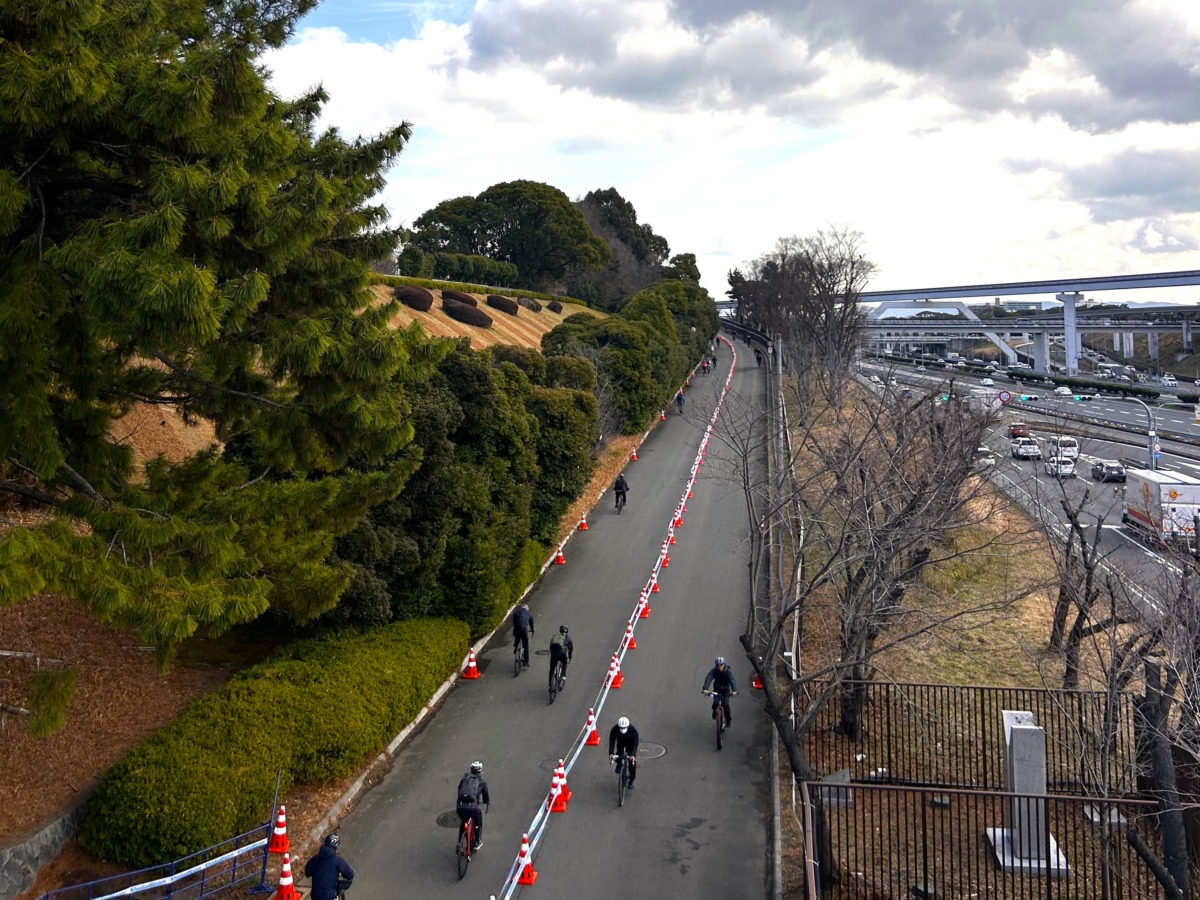 コースは公園の広い園路を使ったレイアウトで、オンロードでは直線、カーブ、ちょっとしたアップダウンもあり、意外と走りごたえがある。ロードバイクなら加速の軽さや巡航の伸びを体験できる。