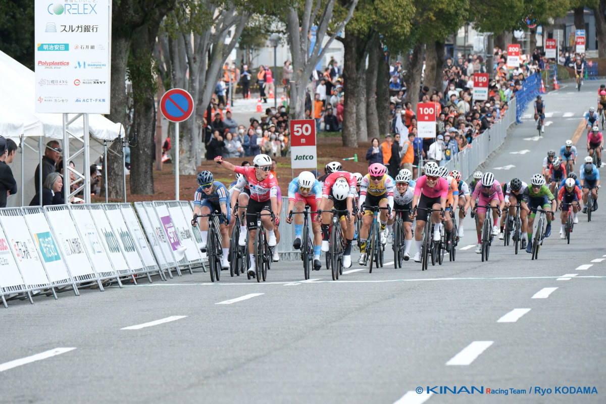 レースが終盤に差し掛かると、集団はスプリント勝負に向けてキナンレーシングチーム、スパークルおおいた、HPCJCブリヂストン・アンカーなどの有力チームがコントロールを開始。逃げを封じ込めにかかる集団のペースはさらに上がり、緊張感が高まっていく。