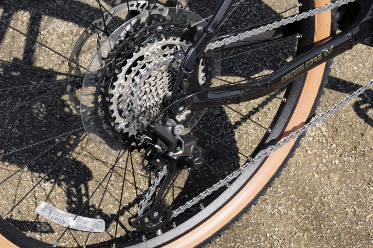 ドライブトレインは、シマノ・デオーレ×12スピード。eバイクは、価格の割に廉価なメカが導入されることが少なくないが、CROSSCORE RVでは、本格MTBコンポが導入されており、スペック面で妥協がないのも魅力。