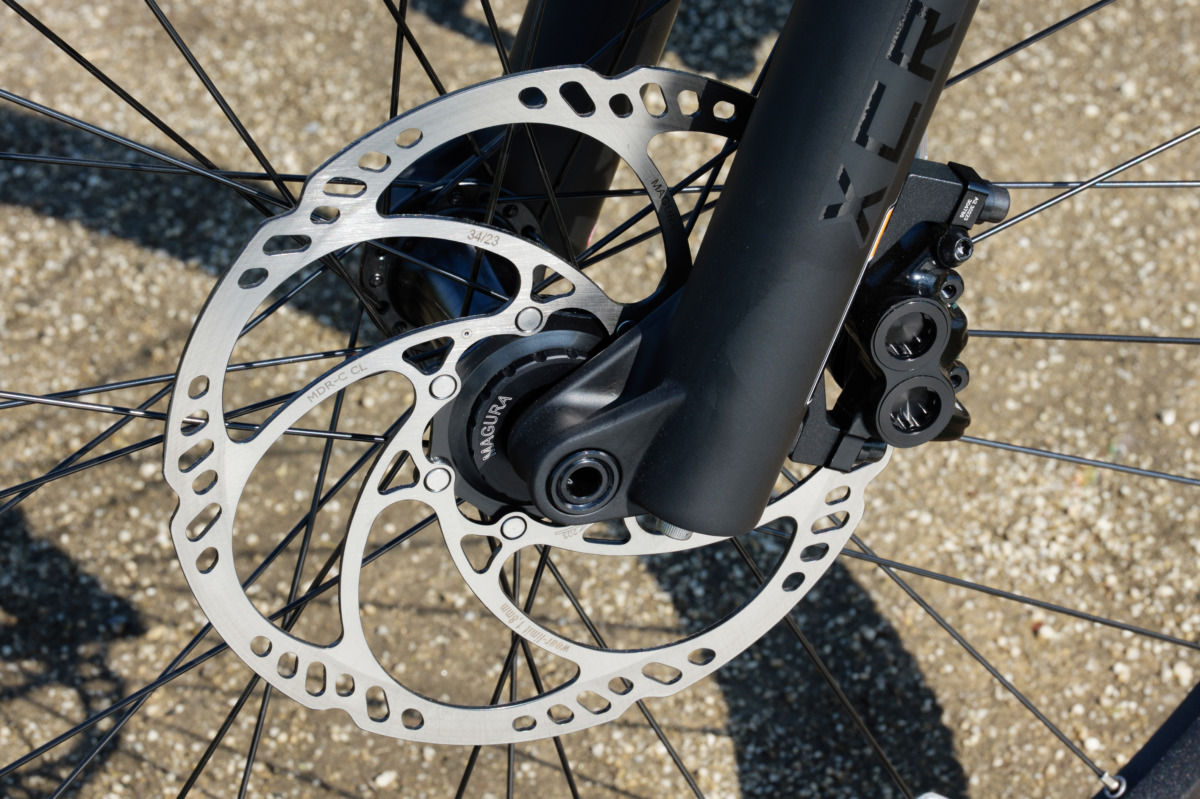 ブレーキにはマグラ製油圧ディスクを採用。都市部のストップ&ゴーでも、トレイルの下りでも安定した制動力を発揮する。