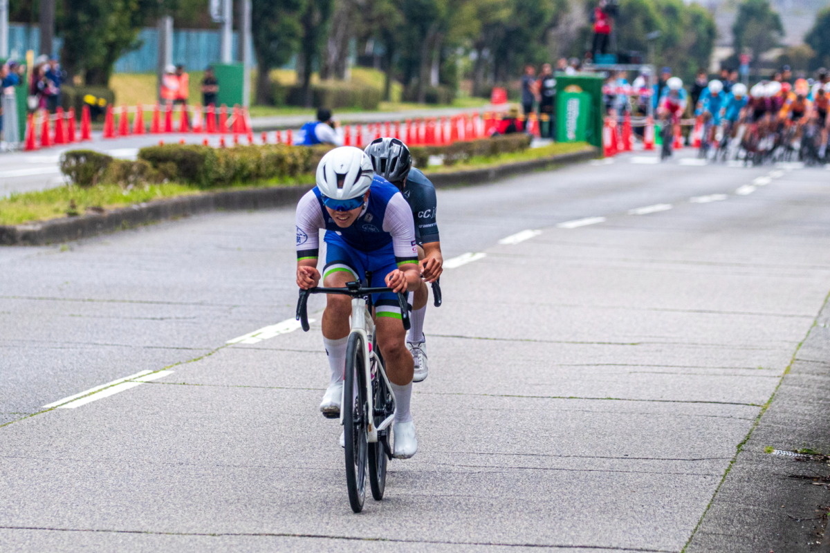 レースが動いたのは終盤の18周目。渡辺一気(京都産業大学)と大山航平(イナーメ信濃山形)が先行し、やがて大山と代わるように島崎将男(群馬マンモスレーシング)が合流。ともに北海道出身20歳の渡辺と島崎が同世代タッグを組み、後続のプロトンから約10秒のタイムギャップを保ちながら逃げ続ける熱い展開となる。