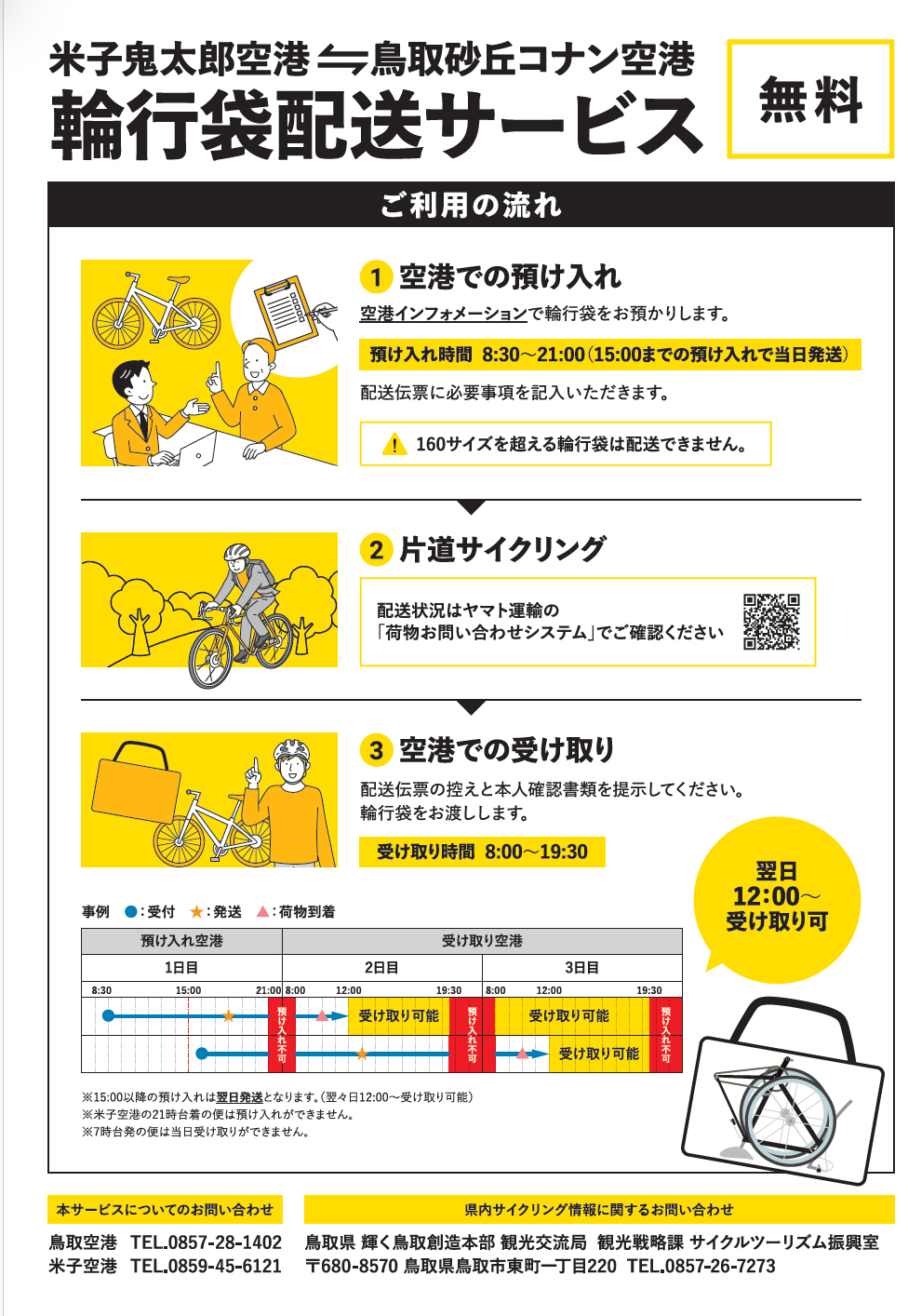 今回、鳥取県や鳥取砂丘コナン空港、米子鬼太郎空港などが連携して開始する本サービスは、そうしたサイクリストの悩みを鮮やかに解決してくれる。鳥取砂丘コナン空港(県東部)と、米子鬼太郎空港(県西部)の2つの空港間で、輪行袋を無料で配送してくれるのだ。
