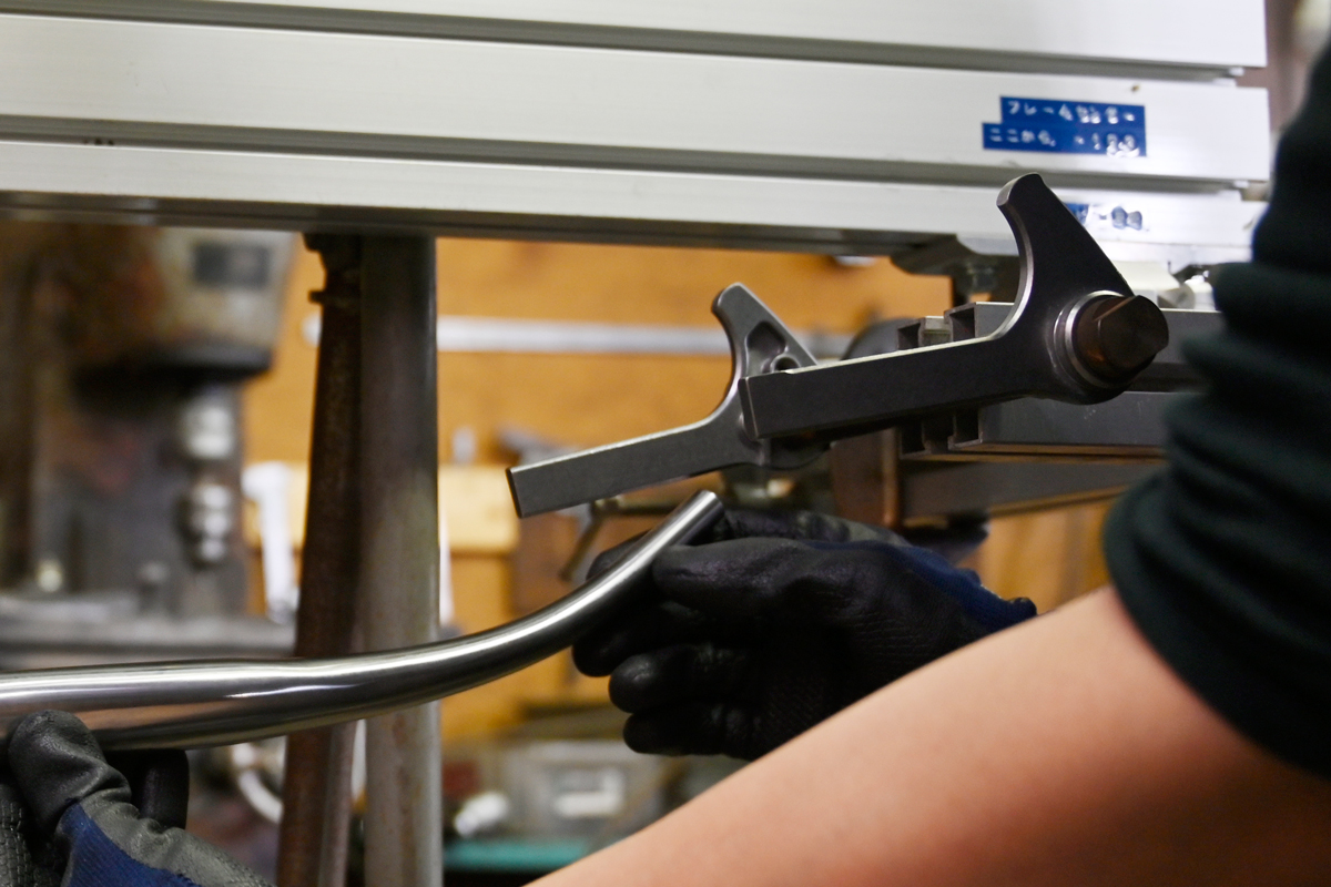 曲げるとカンタンに言ってはいるものの、肉薄パイプの場合は思いのほか難しく、メインパイプなど厚さ1mm未満のものや、焼き入れされているパイプはなおさら難しい(熱間で曲げるか、専用冶具を使わないと座屈してしまう)。だが、チェーンステーやフォークブレードはメインパイプよりも厚みがあるため、冷間でも比較的曲げられるのだ。