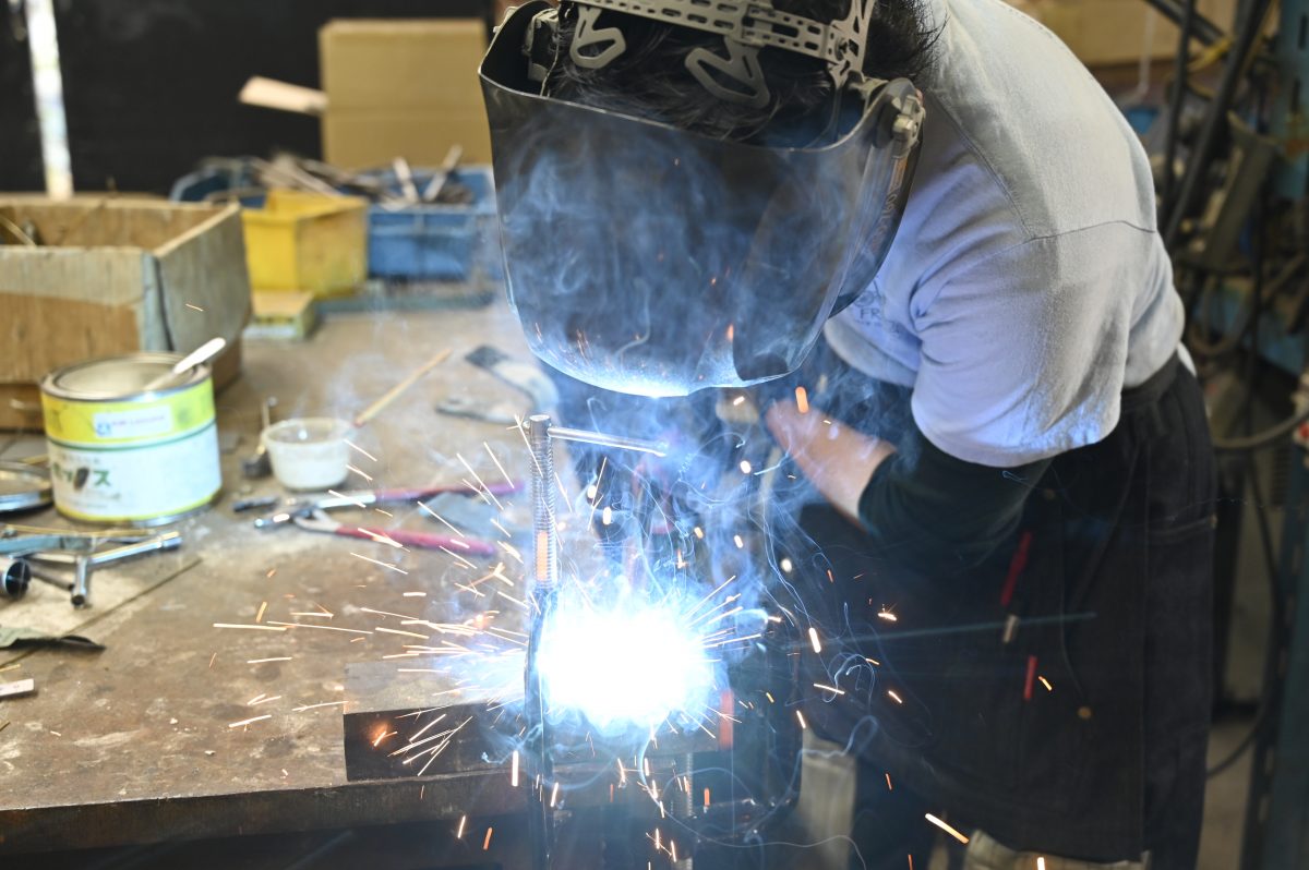 ティグ溶接に比べてカンタンと言われるミグ溶接だが、初めてなので仕上がりはあまりキレイにはならず……だが、しっかり溶接はできたようで、面を削って形を整えていく。