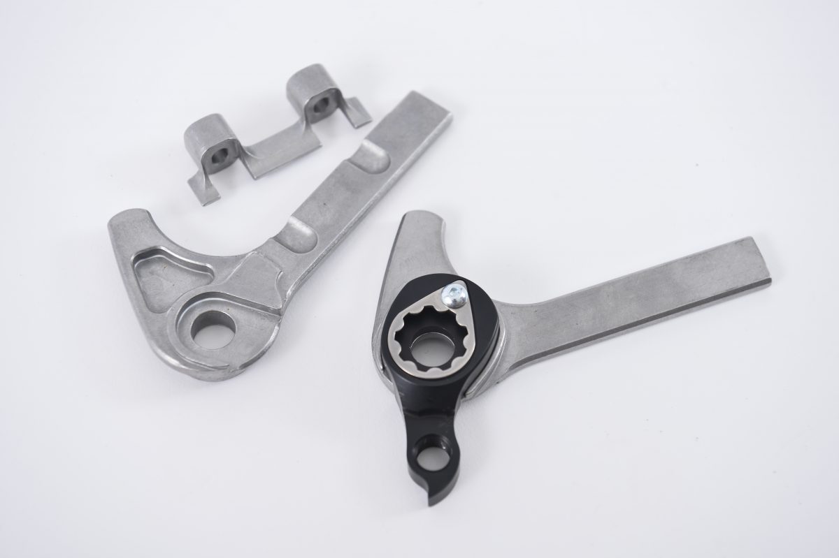 完成した改造リアエンド。元の形状に比べて右下側に板を延ばすことができた。これを曲げた右チェーンステーに合わせて、ロウ付けしていく。