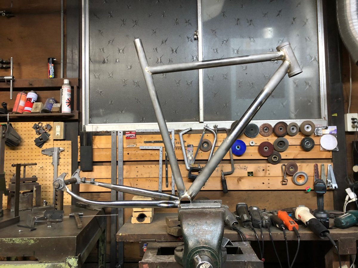 スルーアクスルはエンド側の精度(ホイールをまっすぐに装着できるか)が極めて重要なので、これはトモヒロの場合だけかもしれないが、まず前三角とチェーンステーをロウ付けして、芯を確認してからシートステーを接合していく。下がチェーンステーをロウ付けした後の状態だ。