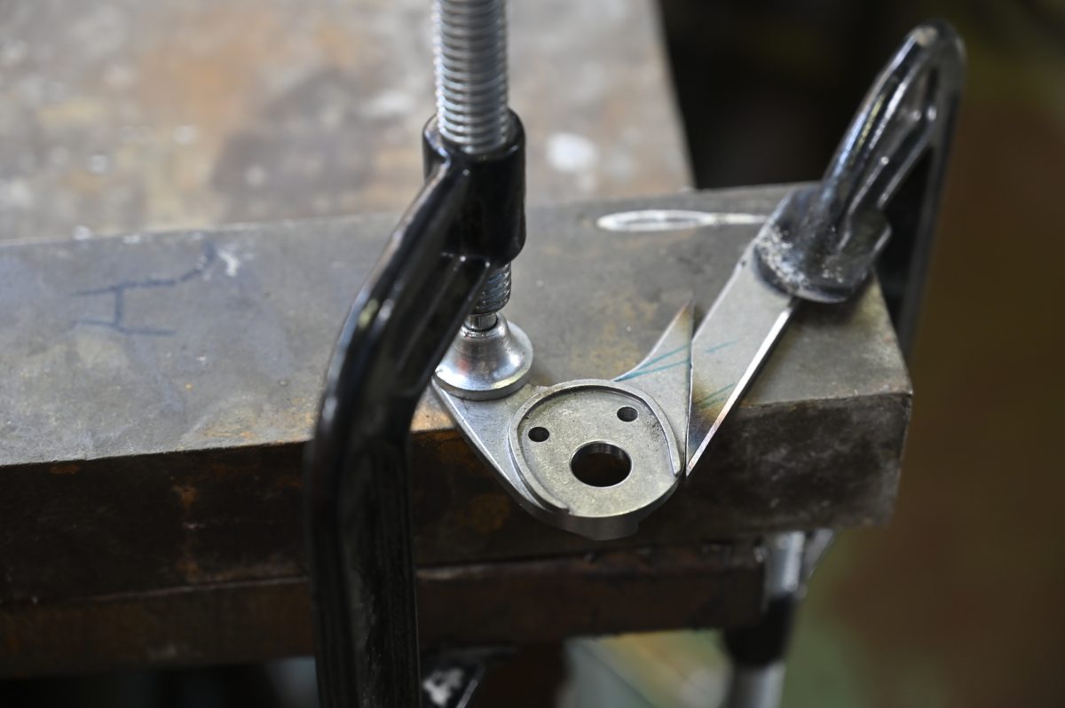 以前、バイシクルクラブの誌面でも紹介したこのXシフターは、じつは結束バンドで取り付けるという仕組み。幅広いフレーム形状に対応可能……というのはいいが、正直、美学も追求するハンドメイドバイクにはいただけない。そこで、いっそ直付け仕様にしてしまえ!と考えたわけだ。