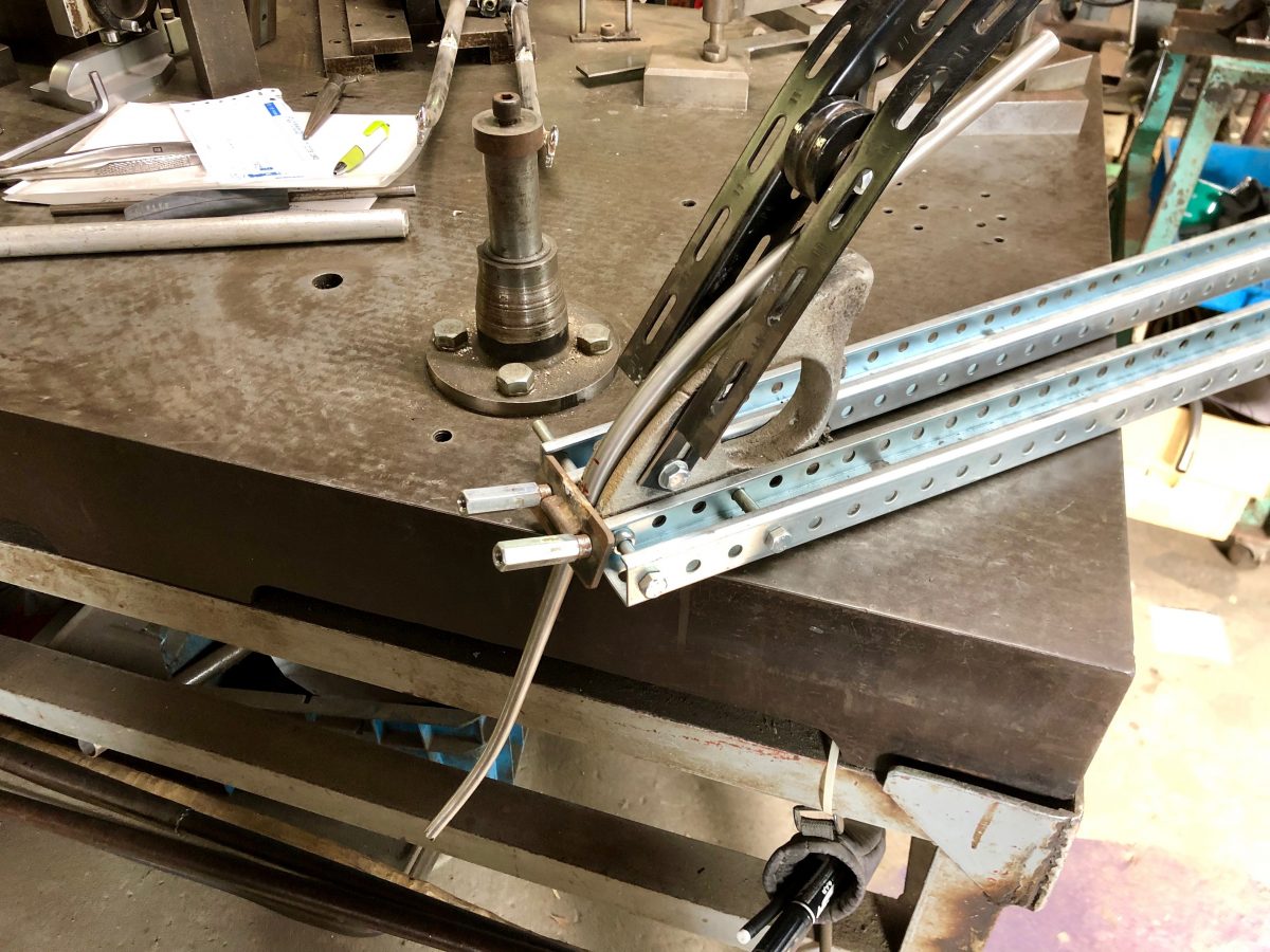 というわけで、今回は「右チェーンステーだけ曲げる」という妙案を実行。フォークブレード曲げ用の冶具にチェーンステーをセットし、体重をかけてぐいっと曲げる。
