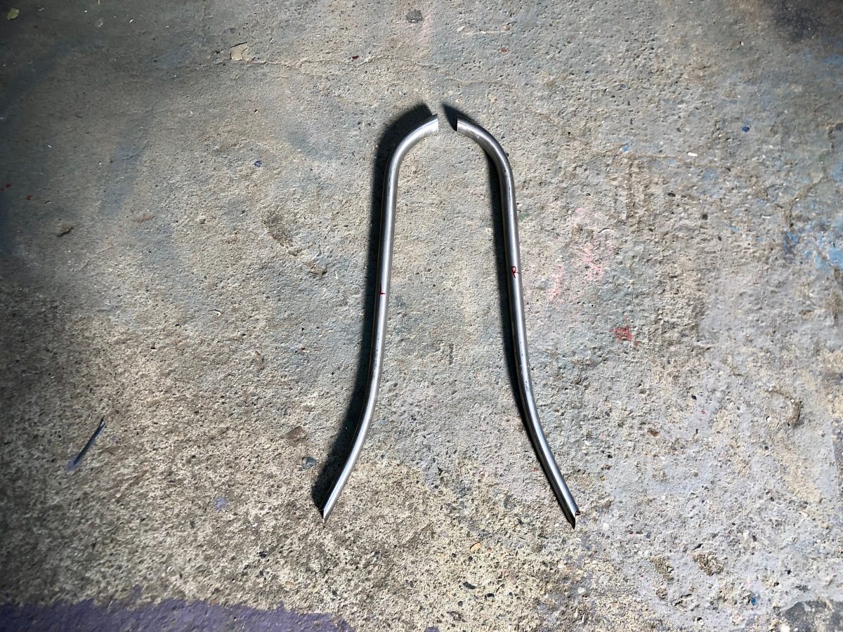 ハンガー下がり75mmになるよう、アールを確認しながら決め打ちドン。できた右チェーンステーがこちら。細かいな調整はエンド側で行うものとし、ハンガー側をザグる。