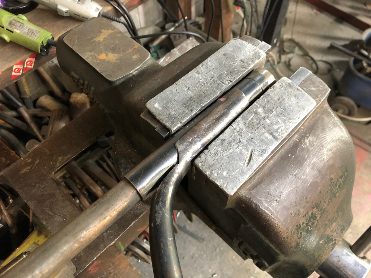 まっすぐ切り落としたエンドを写真のようにスライドさせ、接合する方向に延長させる。位置をよく確認したら溶接面付近をペーパーで磨いて、万力で固定して溶接する。