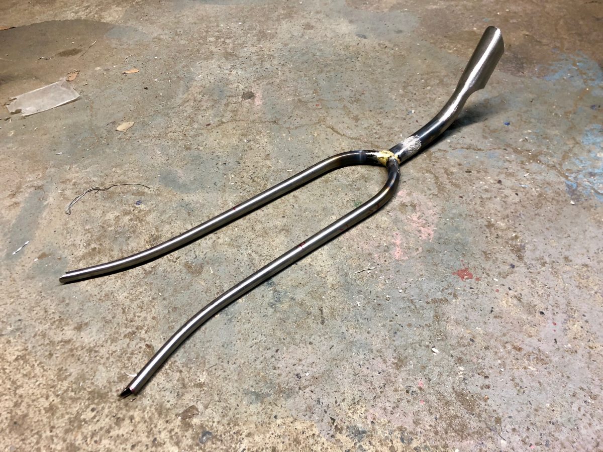 3本のパイプをロウ付けして、モノステー型のシートステーが完成。ガス抜き穴はここで開けておく。