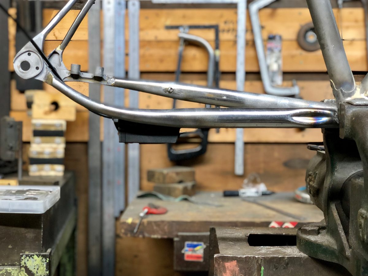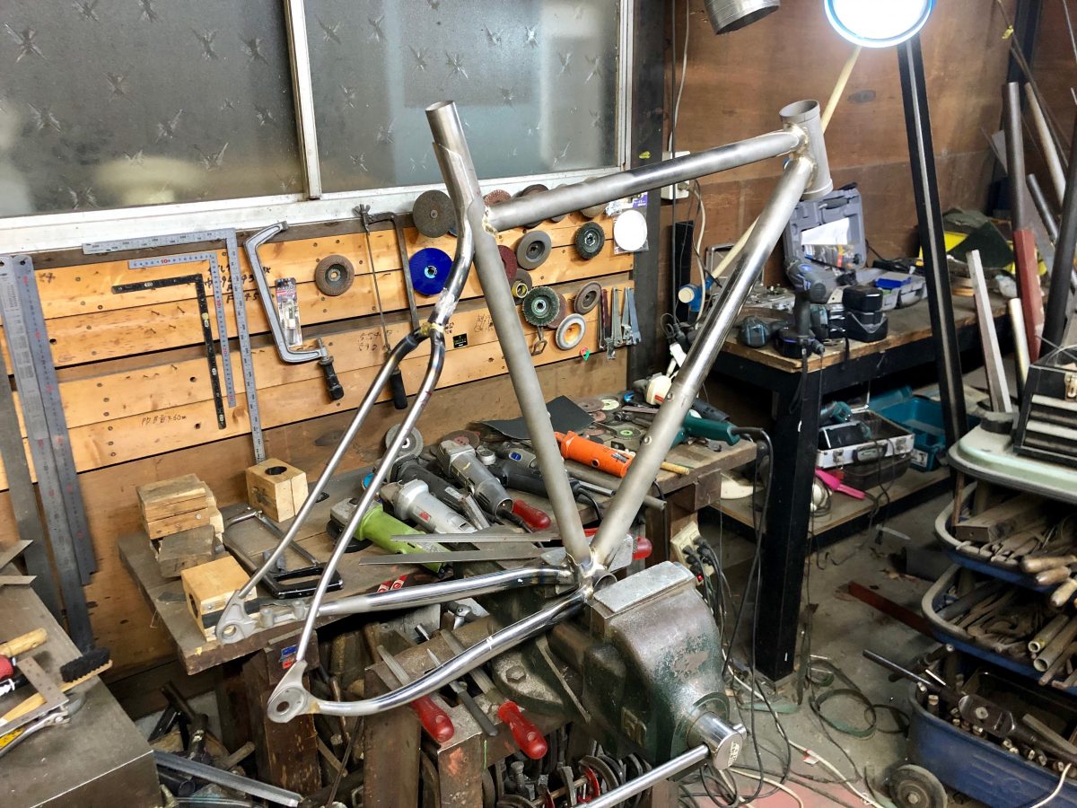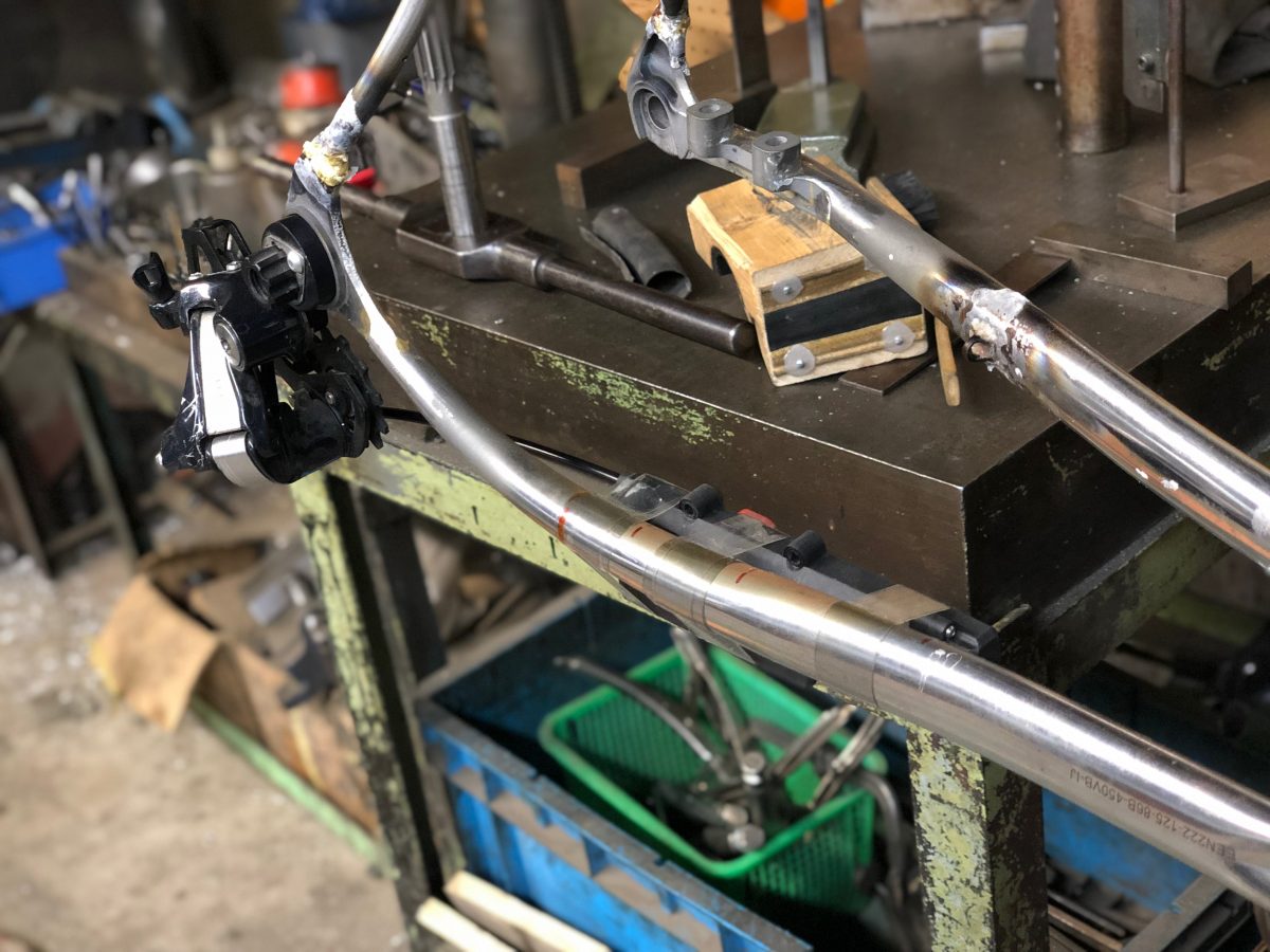 モノステーの付け根部分はアールがきついのでトーチで炙りながら曲げる。その後切り込みを入れてパイプを押し込み、さらに万力で押し広げてラグのようにシートチューブに被さるデザインに。このパイプは強度をもたせるためにシートステーよりも肉厚があるものを採用した。