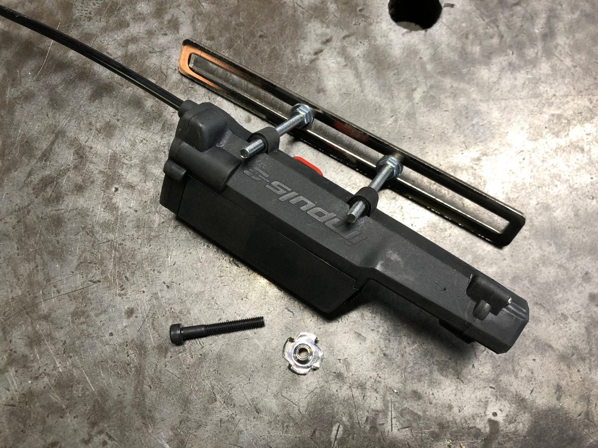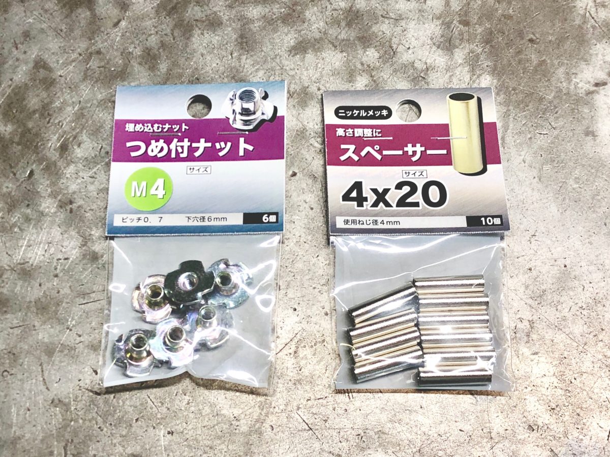 必要なクリアランスやネジ径を調べ、ホームセンターで材料を買ってきた。もちろんXシフター台座用なんてものはないので、既成品の組み合わせだ。ボトルケージ台座(M5)が使えればよかったのだが、今回必要なのはM4だったので、受けのナット用につめ付きナットを使う。