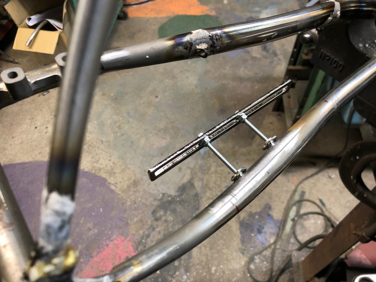スルーアクスルはエンド側の精度(ホイールをまっすぐに装着できるか)が極めて重要なので、これはトモヒロの場合だけかもしれないが、まず前三角とチェーンステーをロウ付けして、芯を確認してからシートステーを接合していく。下がチェーンステーをロウ付けした後の状態だ。