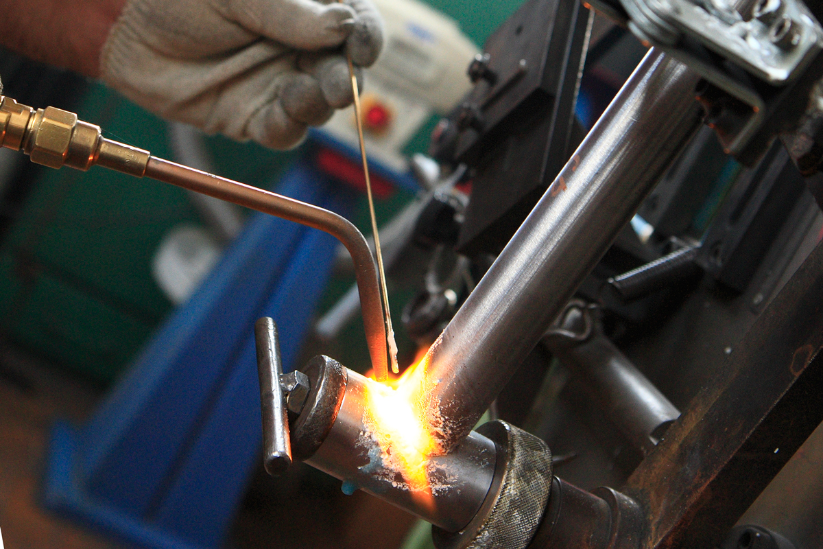 クロモリフレーム&フォークの接合は、ガストーチ(酸素-アセチレン、または酸素-プロパン)によるロウ付けが一般的だ。ロウ付けは正しくはロウ接といい、母材(パイプやラグ)を溶かさずに、毛細管現象によって母材間すき間にロウを流し込んで結合する方法をいう。広義にはハンダ付けもロウ接に含まれるが、ハンダが軟ロウを使うのに対し、クロモリフレーム&フォークには真鍮ロウや銀ロウといった硬ロウ(融点450度以上)が使われる。また、ロウ接は母材を溶かさないので、厳密には溶接(母材を溶かす)とは区別して語られる。