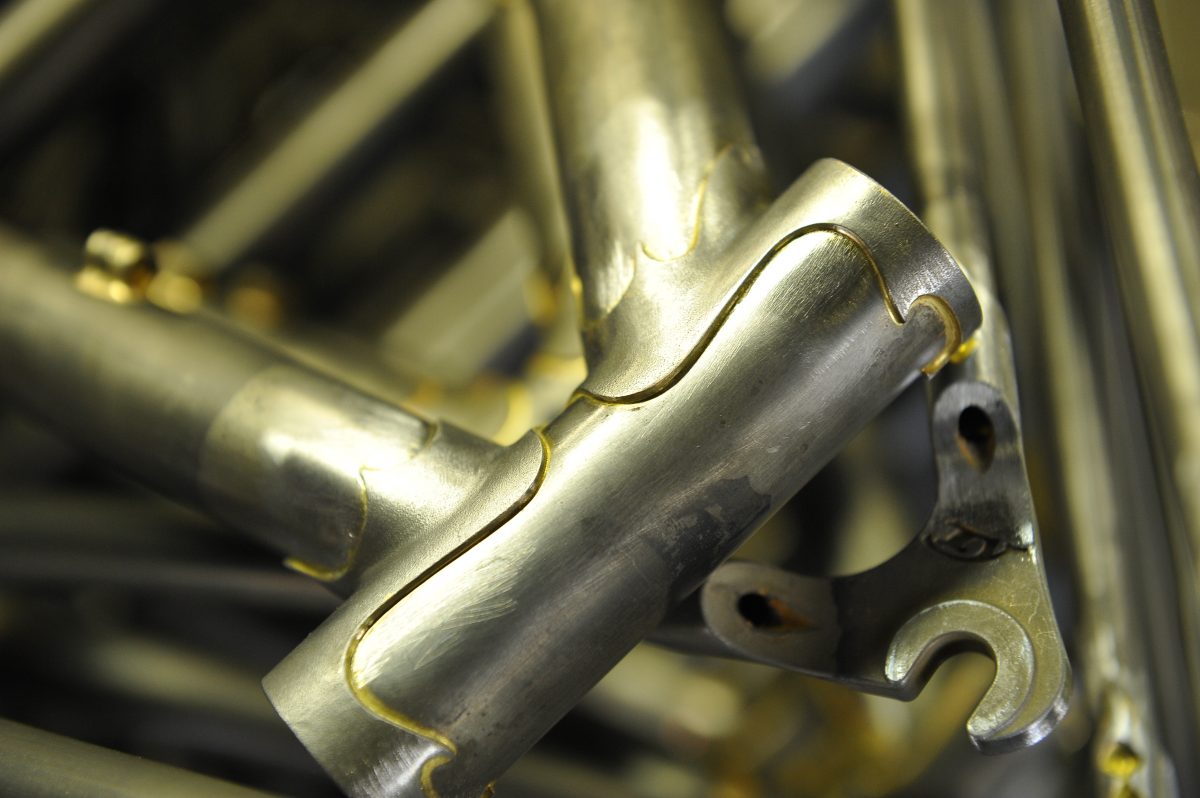 一見するとティグ溶接のようだが、パイプとパイプの接合部内側にあらかじめロウを置いておき、トーチで熱して接合する方法。熟練したビルダーであればほぼ仕上げる必要がなく、極めてシンプルな仕上がりに。