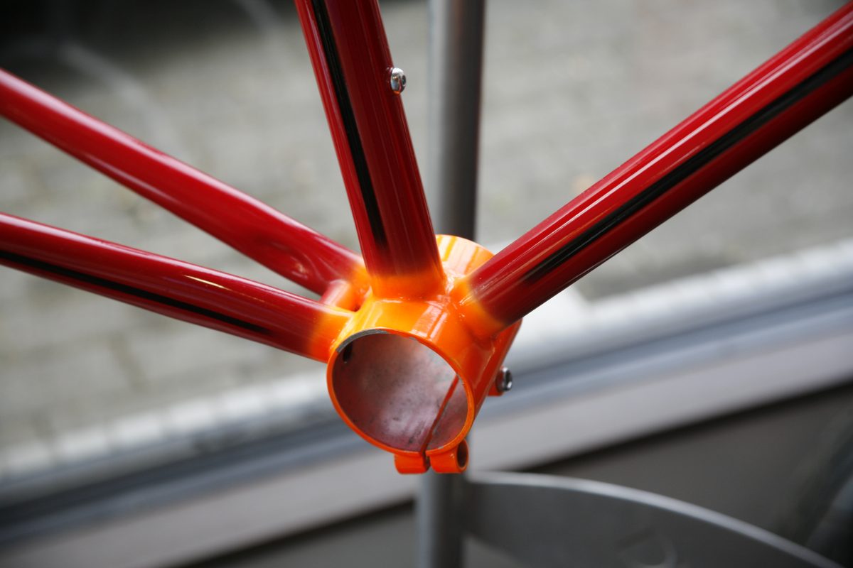 パイプの真ん中を塗り分けるパターン。写真のようにシートチューブの場合もあれば、ダウンチューブの場合、両方の場合もある。クラシカルな雰囲気。