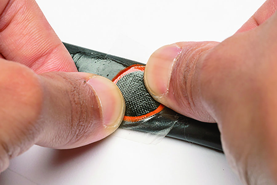 ゴム糊を塗った面にパッチを当て、上から指でしっかりと押しつける。