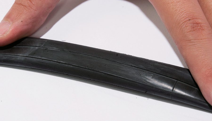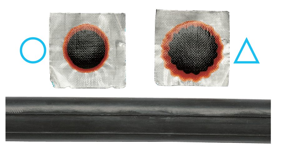 修理キットを買うといくつかのサイズのパッチが入っているので、チューブの幅に合ったものを選ぼう。選ぶときの目安はチューブからパッチがはみ出ないことで、上の場合は左が正解だ。