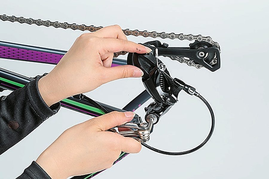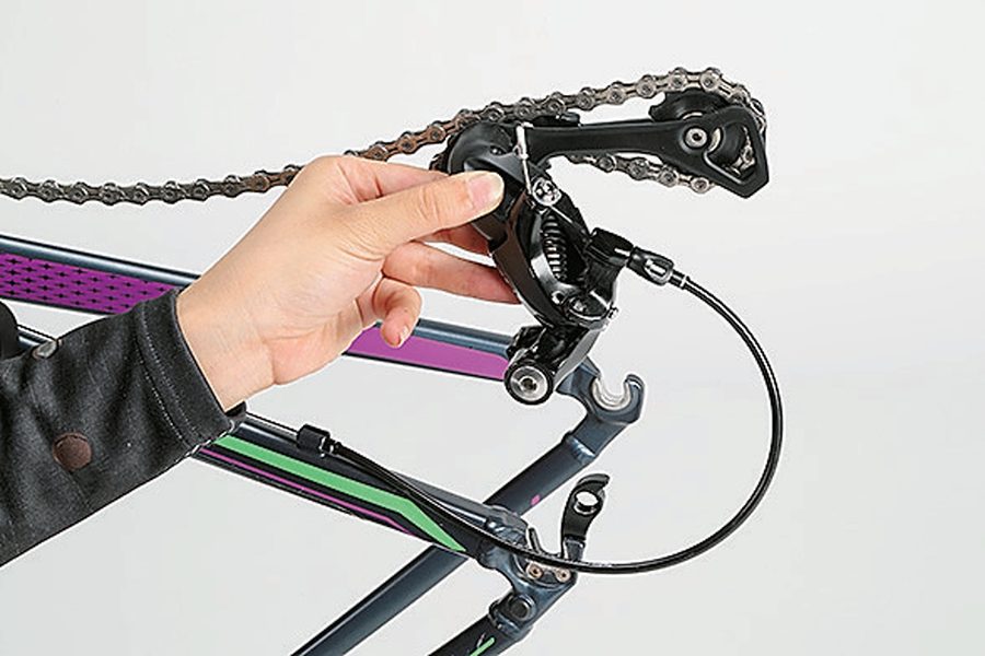 リアディレイラーを外す。エンドのツメにトルクがかかった状態で付いているので、外れる瞬間に飛ばないように手で支えながら行う。