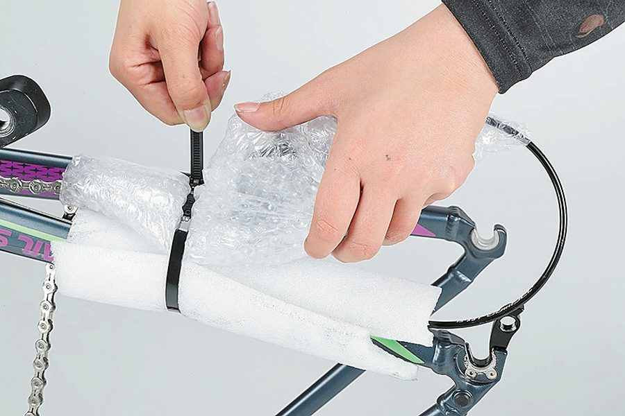 外したリアディレイラーを梱包材で保護し、タイラップでチェーンステーに固定する。リアディレイラーなどが重さでブラブラしないようにしっかりと固定しよう。