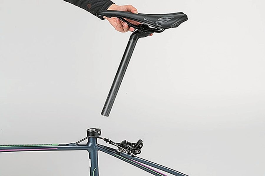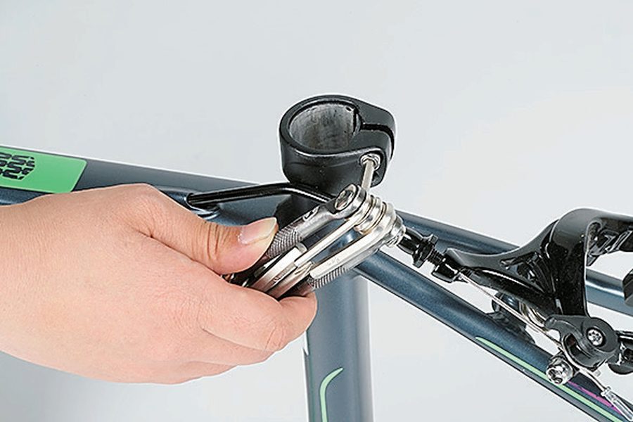 サドルクランプのボルトをゆるめ、サドルとシートポストを外す。クランプが外れないようにボルトは締め直しておく。クランプ部分はタオルで保護するといい。