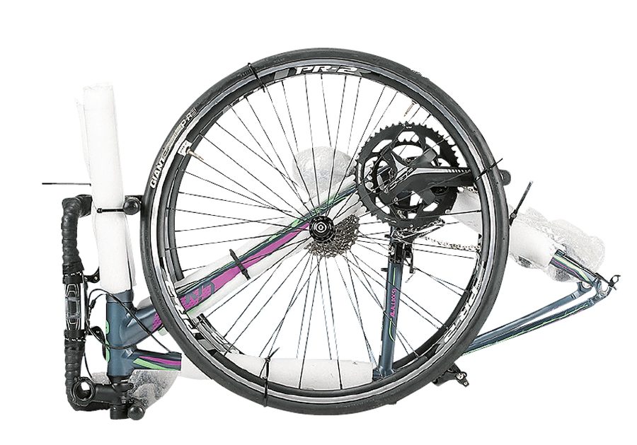 前後輪を外し、クイックを抜く。バイクを倒立させ、フレームやクランクに梱包材を取り付ける。ハンドルとキャリパーをフォークに固定、前後輪でフレームをはさんで固定する。