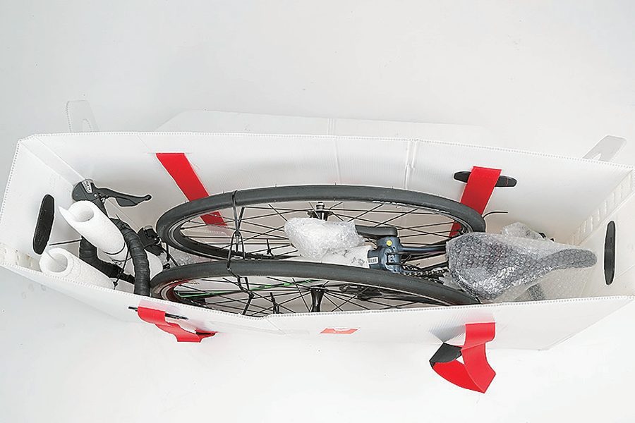 固定した状態のまま、輪行箱に収納する。小物類やペダル、前後輪のクイック、サドルなど、外したすべてのパーツを忘れずに梱包し、すきまに収納する。