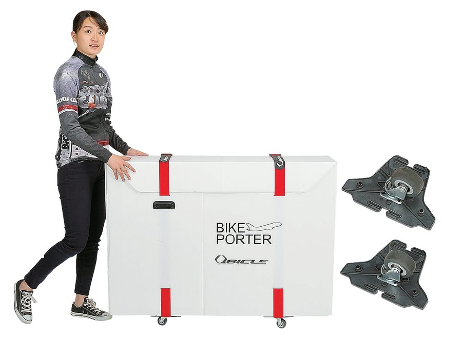 別売りの専用マルチキャスター(5500円/税抜)を、バイクポーターの底面の赤いベルトに取り付けることで、輪行箱を転がして移動できる。空港やホテルでの運搬に便利。STD、PRO共通