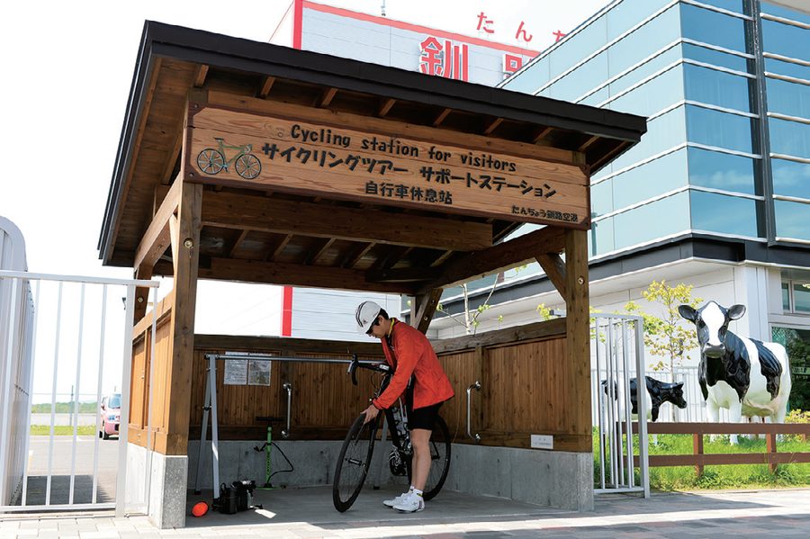 自転車の組み立て作業は、もちろん建物の外で。ほかの利用客のジャマにならないところで行う。大分空港、松山空港、新千歳空港など地方の空港では、輪行用のスペースを設置しているところもあ