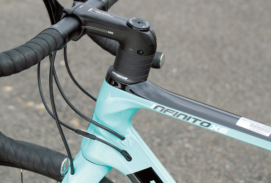 ケーブル類は上位モデル同様にフレームに内装される。ステムはスペーサーを含めてエアロ形状の専用品がアッセンブルされる。スペーサーを通常のものに変更すればステムの交換も可能だ
